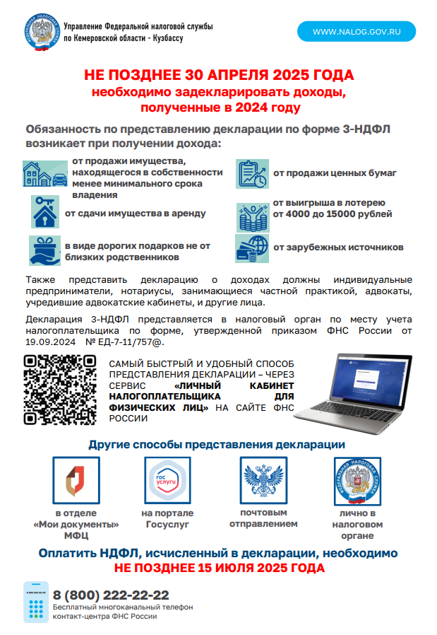 УФНС России по Кемеровской области - Кузбассу информирует о том, как проверить и оплатить налоговую задолженность, а также о необходимости задекларировать доходы, полученные в 2024 году.