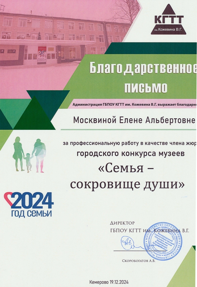 19 декабря 2024 года на базе Кемеровского горнотехнического техникума имени В. Г. Кожевина состоялся городской конкурс музеев профессиональных учреждений города Кемерово «Семья-сокровище души», посвященный Году семьи в России.