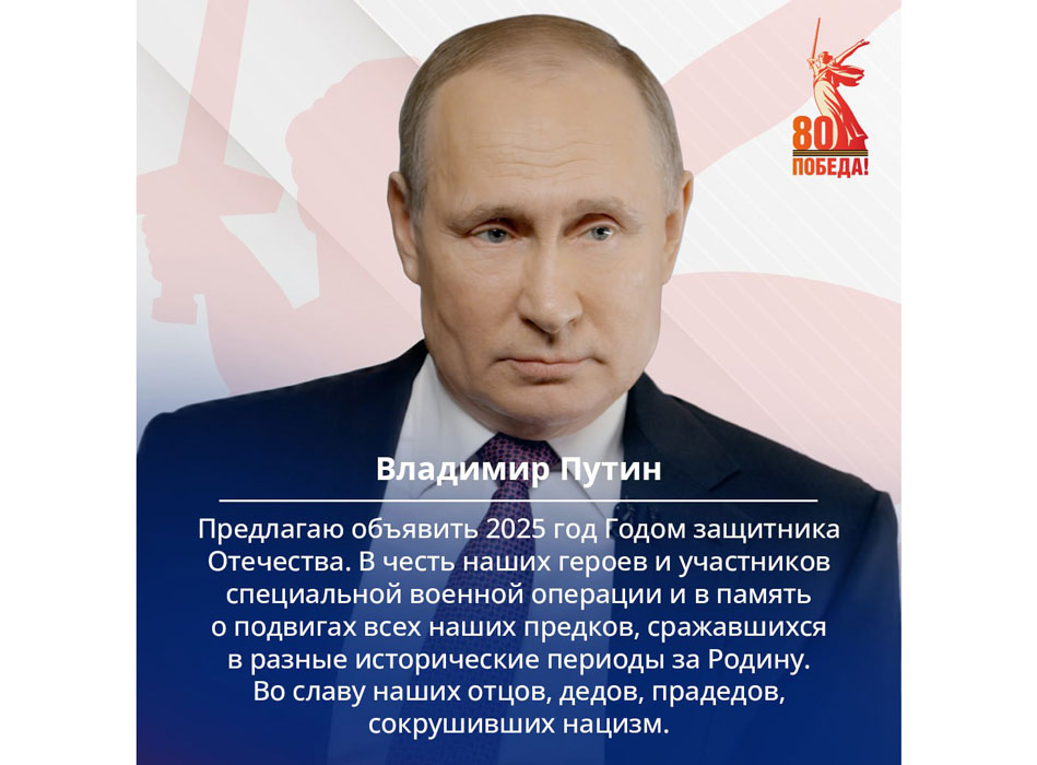 Президент России Владимир Путин объявил наступивший год 80-летия Победы в Великой Отечественной войне Годом защитника Отечества.
