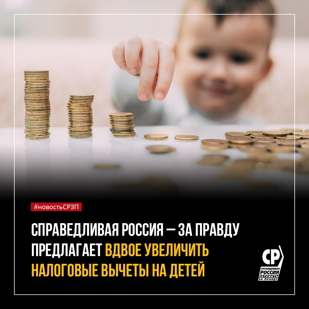 Социалистическая партия "СПРАВЕДЛИВАЯ РОССИЯ – ПАТРИОТЫ – ЗА ПРАВДУ" предлагает повысить вычеты для родителей, усыновителей, опекунов детей до 18 лет, а при обучении на очной форме – до 24 лет; на первого и второго ребенка увеличить вычеты с 1200 до 2400 рублей, на третьего и последующих детей – с трёх до шести тысяч рублей; вычеты на детей с инвалидностью повысить с шести до 12 тысяч рублей; единственным родителям предоставлять вычеты в двойном размере; повысить необходимую для применения вычетов величину предельной суммы годового дохода гражданина – с 350 до 600 тысяч рублей.
