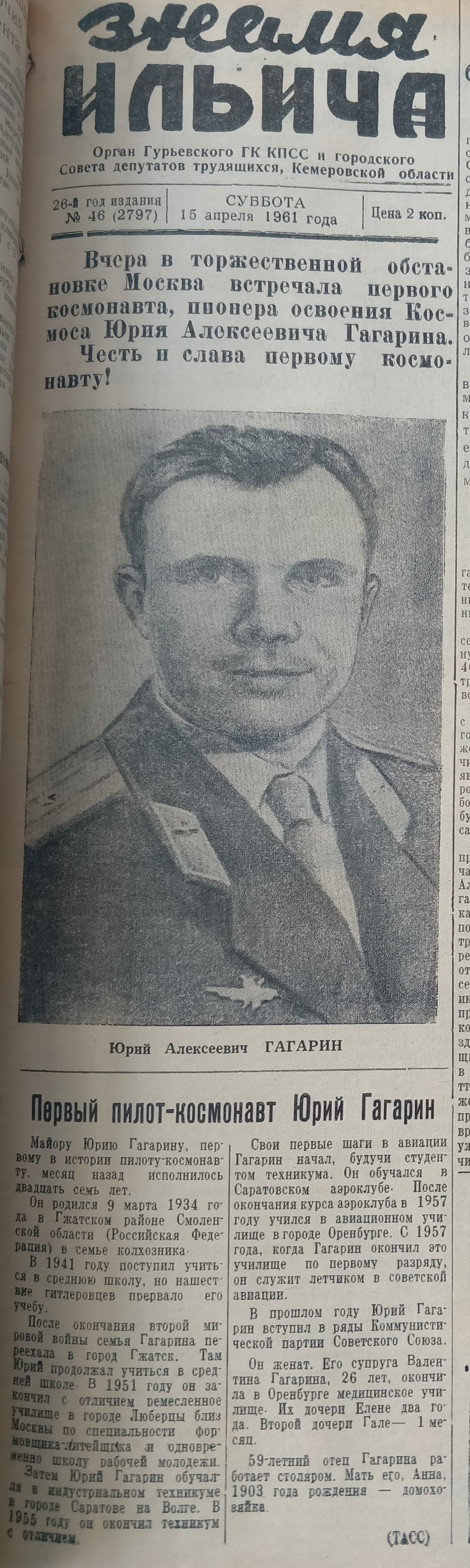 В архивных документах Гурьевского муниципального архива имеются публикации газеты «Знамя Ильича» № 45 от 14 апреля 1961 года «О первом в мире полете человека в космическое пространство».