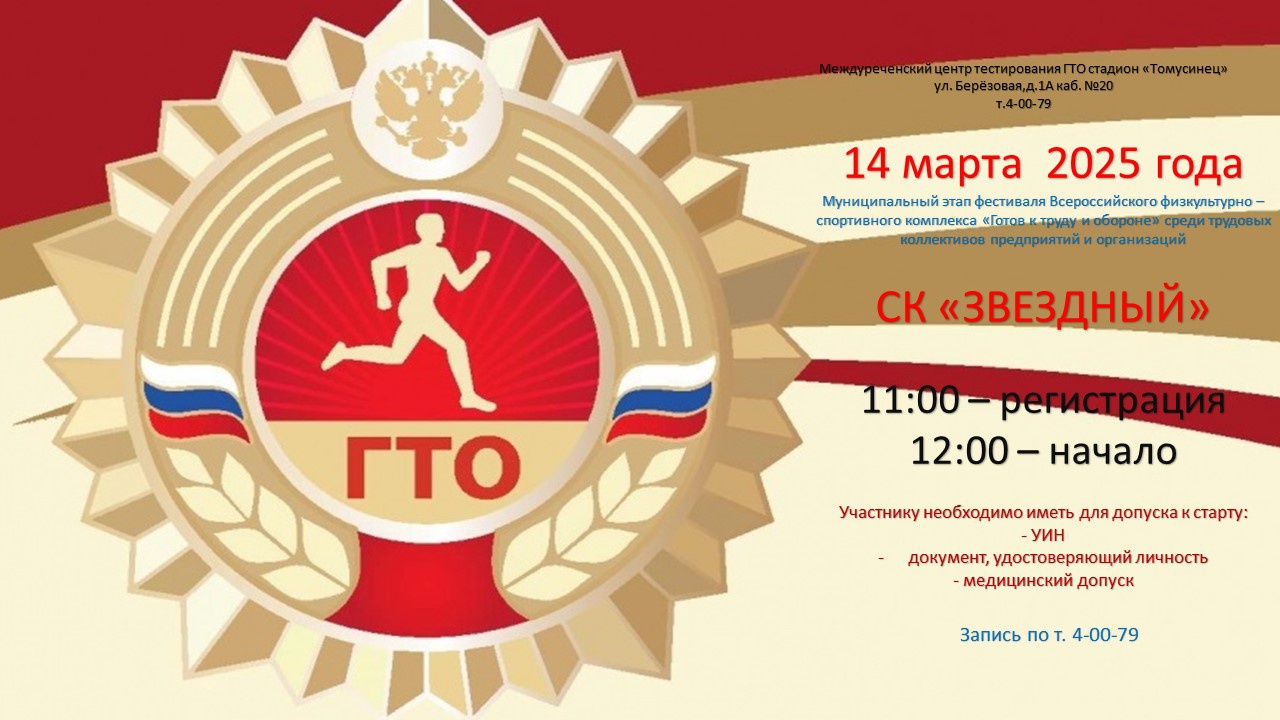 14 марта 2025 года в СК «Звездный» состоится муниципальный этап фестиваля ВФСК ГТО среди трудовых коллективов, посвященный 80-летию Победы в Великой Отечественной войне.
