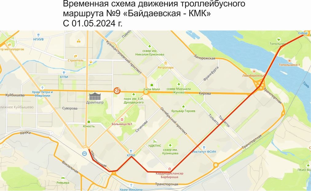 №5 «Вокзал – КМК» - временно приостановлен до окончания работ; №2 и №9 «Байдаевская – КМК» - от остановочного пункта «Комсомольская площадка» по ул. Дружбы до о/п «Вокзал».На работы первого этапа отведено около полутора месяцев, об изменениях схем проезда транспорта в ходе проведения работ будет сообщено позже. Реализация мероприятий по капитальному ремонту инфраструктуры городского электрического транспорта производится в рамках реализации федерального проекта «Чистый воздух».